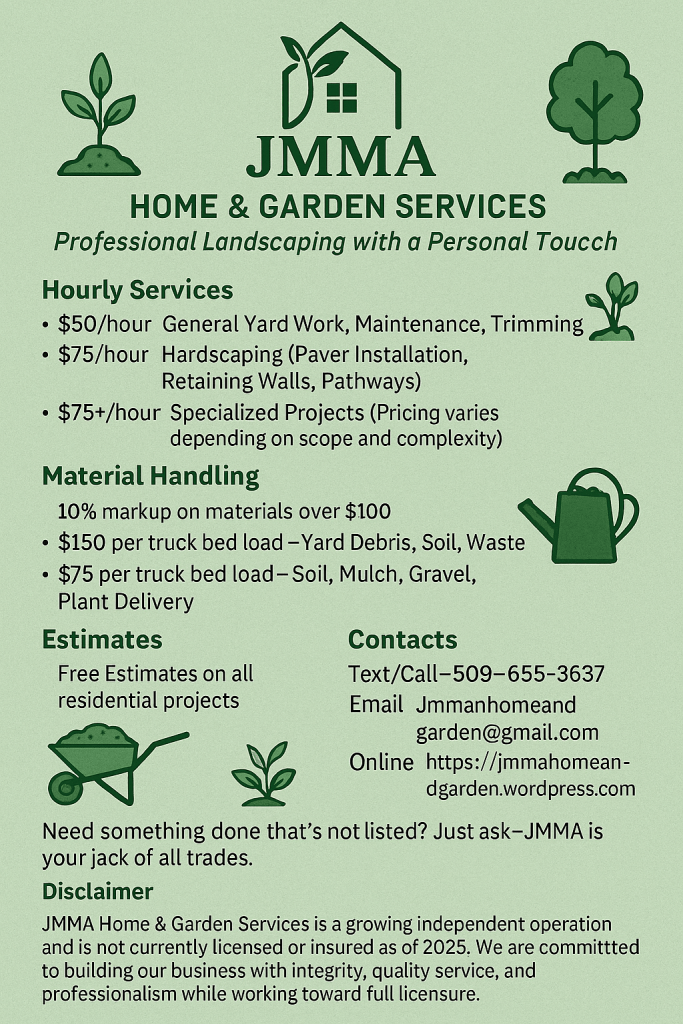 Spokane is my home, and I want to give back by helping homeowners take pride in their outdoor spaces. Whether it’s a simple yard cleanup or a custom hardscape project, I treat every job with respect and care. At JMMA, I’m not just offering a service—I’m building relationships and growing a business rooted in trust, transparency, and hometown values.